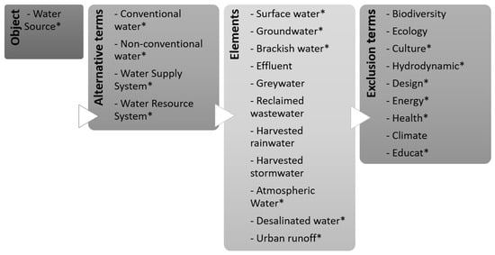 Following our definition of the search topic as “Management of conventional and non-conventional water sources”, the following search components were a priori defined: the search object (“Water Source *”); alternative terms (“Conventional water *”, “Non-conventional water *”, “Water Supply System *”, “Water Resource System *”); elements (“Surface water *”, “Groundwater *”, “Brackish water *”, “Effluent”, “Greywater”, “Reclaimed wastewater”, “Harvested rainwater”, “Atmospheric Water *”, “Desalinated water *”, “Urban runoff *”). Within this structure, elements represent a subset of the search components that capture specific categories of conventional and non-conventional water. To further refine the search and exclude irrelevant results, we also defined exclusion terms not directly related to the search topic: “Biodiversity”, “Ecology”, “Culture *”, “Hydrodynamic *”, “Design *”, “Energy *”, “Health *”, “Climate”, and “Educat *”, where * represents a wildcat search term. The main search terms used in the present systematic literature review are shown in Figure 2.