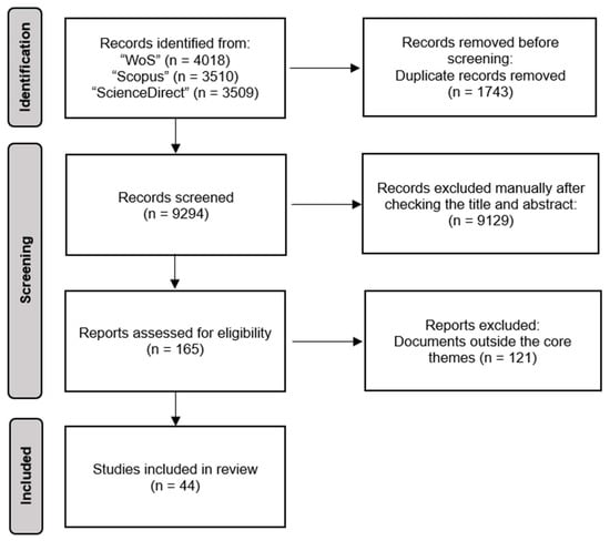 Figure 3 presents the PRISMA flow diagram, detailing the identification, screening, and inclusion of records at each stage of the analysis. The initial search yielded 9294 publications, which were subsequently narrowed down to 44 publications selected for the current review. For the next step, Figure 4 and Figure 5 visualize the keywords’ co-occurrence as determined by the VOSviewer tool [56], where keywords are represented as nodes grouped into clusters. Larger nodes in Figure 4 and Figure 5 denote terms that occur more frequently in the reviewed publications.