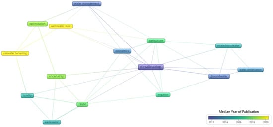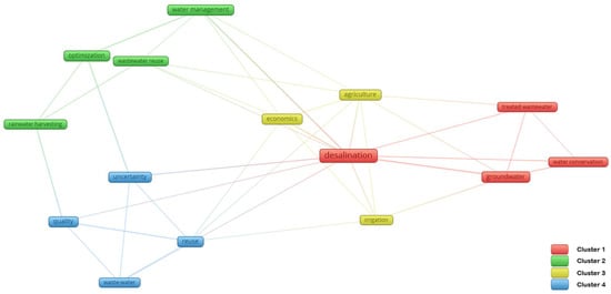 As Figure 4 shows, four clusters were identified: (1) a red cluster focused on groundwater and water conservation, (2) a green cluster on water management, optimization, and wastewater reuse, (3) a yellow cluster on irrigation, economics and agriculture, and (4) a blue cluster focusing on uncertainty, quality, and wastewater. “Desalination” is the central term, strongly linked to groundwater, agriculture, economics, and treated wastewater, indicating its integrative role in the management of non-conventional WSs.