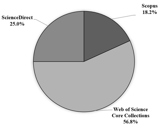Among the 44 publications selected for full-text analysis, 25 (56.8%) come from Web of Science Core Collection, followed by 11 (25%) from ScienceDirect and 8 (18.2%) from Scopus (Figure 6). The observed differences in results can be explained by the different thematic focuses of the databases: Scopus database prioritizes disciplines such as humanities, arts, social sciences, and medicine [58], while the Web of Science Core Collection shows a stronger focus on the natural sciences and engineering [59].