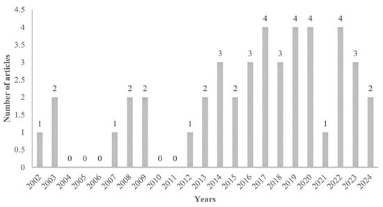 According to Zare et al. [49], the roots of integrated water resources management and assessment can be traced back to previous decades, but the field began to expand significantly around the 2000s and gained popularity among researchers, especially since 2009 [47]. As a result, the present study covers the period from 1999 to 2024. However, the effective search period is limited to 2002–2024, as no relevant studies that focus on the management of HWSM were found before 2002.