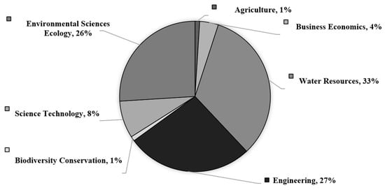 The distribution of publications by the research field is shown in Figure 8. The results show that publications on HWSM cover seven main areas: agriculture; biodiversity conservation; business economics; engineering; environmental sciences ecology; science technology; and water resources. However, the number of publications in the field of “water resources” appears to be the most frequent (20 out of 44 articles analyzed), while the topics of “agriculture” and “biodiversity conservation” are represented by only one publication each (see Appendix B for details).