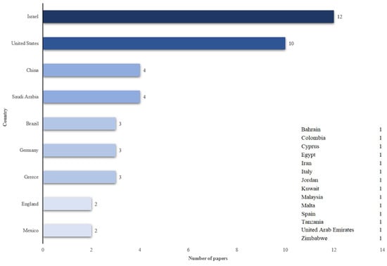 The geographic distribution of publications is shown in Figure 9. Geographically, most papers on HWSM originated in Israel (12), the USA (10), China (4), Saudi Arabia (4), and Brazil/Greece/Germany (3 each). The predominance of publications from these countries may be explained by national policies promoting water security research, significant water scarcity problems, and significant investments in innovative water technologies.