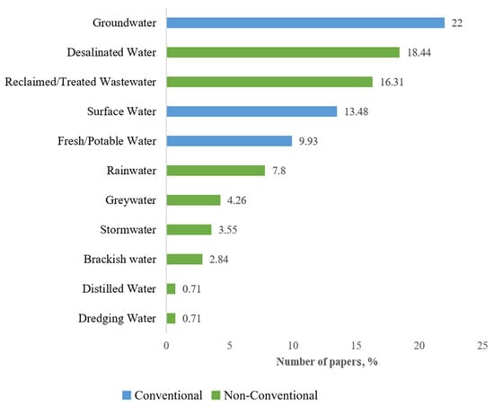 The main objective of the study was to identify the full range of studies focused on integrating conventional and non-conventional WSs within a single management system. An additional objective was to summarize the current state of knowledge on the classification of conventional and non-conventional WSs. The review helped to identify main conventional WSs (groundwater, surface water, and fresh/potable water—used in cases where studies referred to drinking-quality water without specifying whether it originated from groundwater or surface water) and eight non-conventional alternatives (desalinated water, treated wastewater, greywater, rainwater, stormwater, brackish water, dredging water, and distilled water), commonly used in empirical studies on the management of WSs. The study also enabled us to rank the identified WSs by their frequency of use in the HWSM literature, reflecting the current state of knowledge on both conventional and non-conventional WSs.