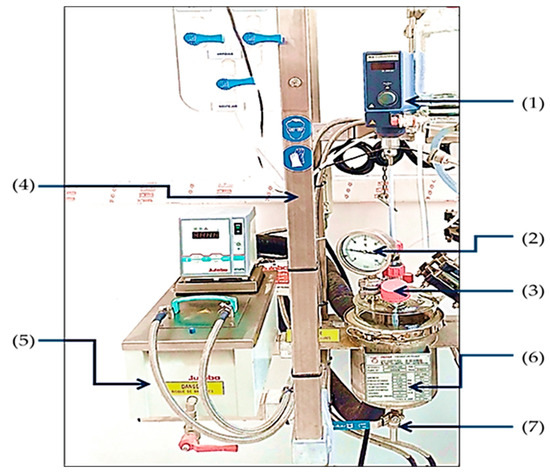 Experimental equipment: (1) Agitator. (2) Thermometer. (3) Inlet of reactor. (4) Apparatus support. (5) Heating thermostat. (6) Reactor. (7) Outlet of reactor.