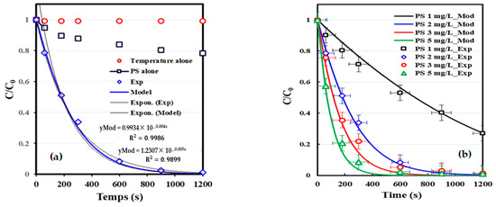 (a) Kinetic model of BCB degradation by thermally activated persulphate (TAP) process (conditions: C0 = 10 mg/L, pHi = 7, [PS] = 2 mg/L, T = 60 °C). (b) Experimental and modeling effect of initial persulfate concentration on the removal kinetics of BCB (conditions: C0 = 10 mg/L, [S2O82–]0 = 1–5 mg/L, pHi = 7, T = 60 °C).
