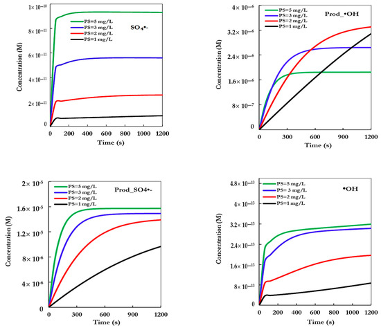 Concentration profiles of ●OH and SO4●─ and their organic products, obtained from their direct reactions with BCB, for various concentrations of persulfate (conditions: C0 = 10 mg/L, [S2O82]0 = 1–5 mg/L, pHi = 7, T = 60 °C).