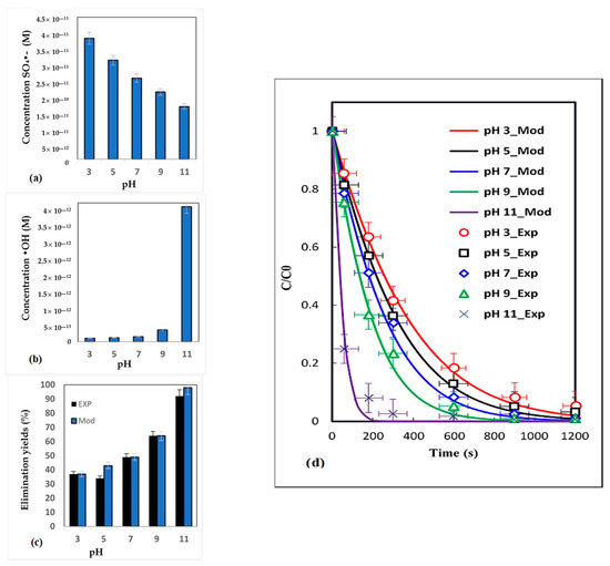 At pH 3, SO4●− and ●OH have values of 3.83 × 10−11 M and 1.04 × 10−13 M, respectively. At alkaline pHs (9 and 11), the predominant species are inverted, with the majority being ●OH [44].