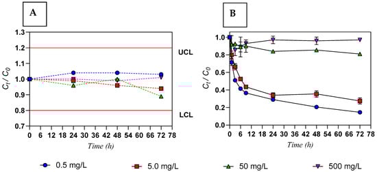 Ratio between the concentrations of Y at time t (Ct) and at initial condition (C0) in contaminated water over 72 h: (A) in absence of seaweed (control—dashed lines); (B) in contact with living seaweed (Ulva sp.—solid line). Results are expressed as mean values and error bars represent the standard deviation (n = 3). Initial concentration of Y of 0.5; 5.0; 50; 500 mg/L; initial seaweed density of 6.0 g/L (FW); salinity 10 g/L. Upper control limit (UCL; Ct/C0 = 1.2) and lower control limit (LCL; Ct/C0 = 0.8) are depicted as a red line.