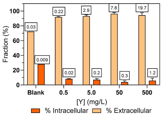 Extracellular and intracellular fractions of Y in Ulva sp. after 72 h exposure to different initial Y concentrations in water (blank; 0.5; 5.0; 50; 500 mg/L), operationally defined by extraction with 0.001 mol/L EDTA L in 0.6 mol/L NaCl. Values inside the square indicate the amount of Y (µg/g) inside and outside Ulva sp.