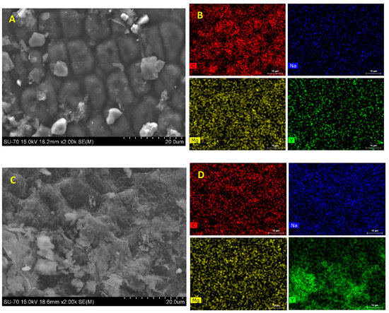 Scanning electron microscopy images (A,C) and respective energy dispersive X-ray mapping of main elements (B,D) on Ulva sp. surface before (A,B) and after (C,D) exposure to 500 mg/L of Y (Carbon–red, Sodium–blue, Magnesium–yellow, Yttrium–green).