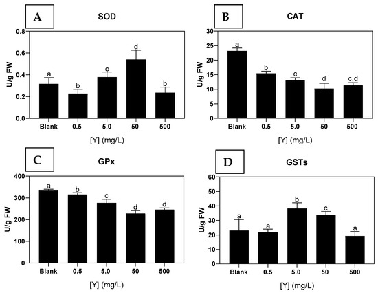 (A)-Superoxide dismutase (SOD); (B)-Catalase (CAT); (C)-Glutathione peroxidase (GPx); (D)-Glutathione-S-transferases (GSTs) activities in Ulva sp. from the blank condition and after exposure to different concentrations of Y (0.5; 5.0; 50; 500 mg/L) for 72 h. Results are expressed as mean and standard deviation (n = 9). Different letters indicate significant differences (p < 0.05) between the conditions.