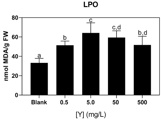 Lipid peroxidation (LPO) levels increased significantly in seaweed exposed to all Y concentrations compared to the uncontaminated control (blank condition), with the highest levels observed in seaweed exposed to Y concentrations of 5.0, 50, and 500 mg/L (Figure 5).