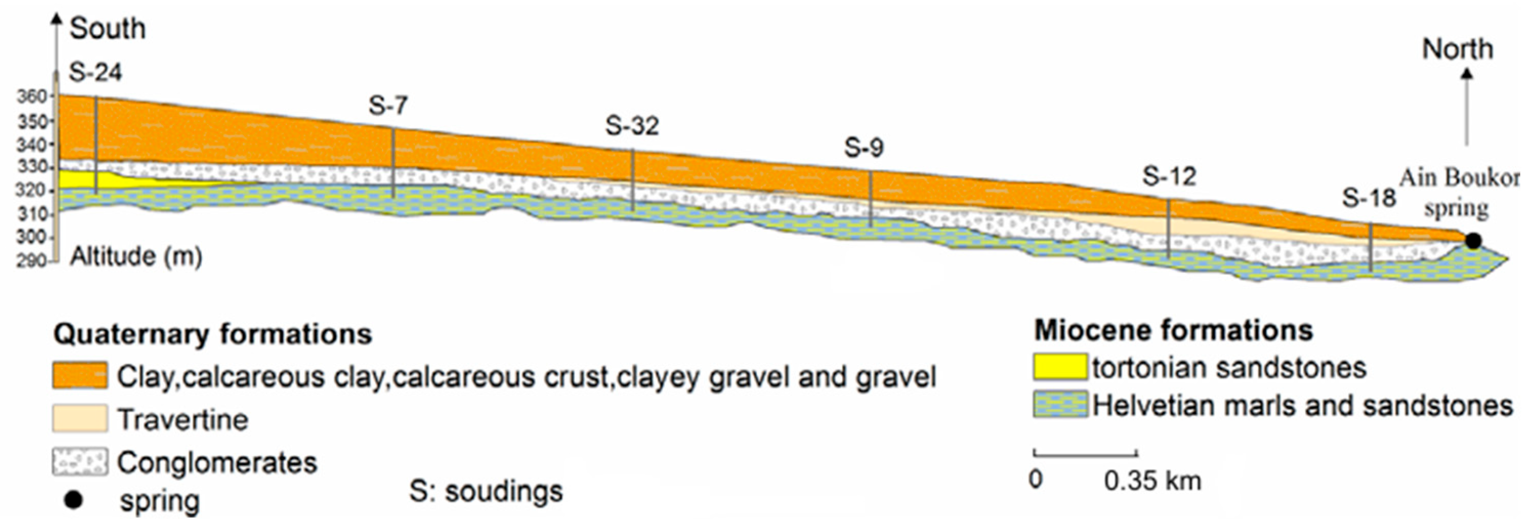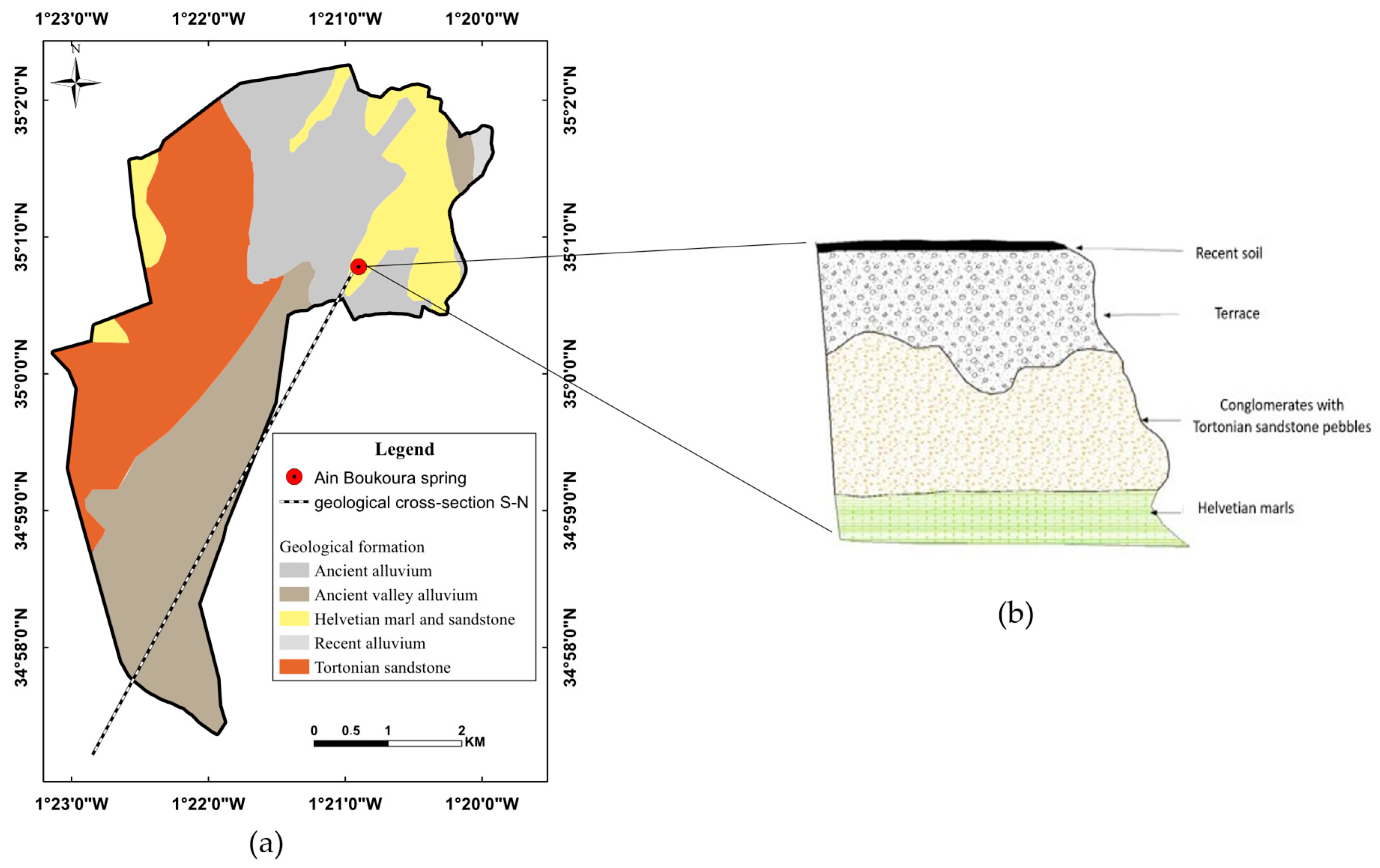 - Aquifer Characteristics: The wells and boreholes studied are at medium depths (between 35 to 110 m), which contributes to the observed water–rock interaction patterns. The intermediate Na+/(Na++ Ca2+) ratios (around 0.5) likely indicate a mixed aquifer, composed of both carbonate formations (calcium source) and silicate formations containing sodium feldspars (sodium source).