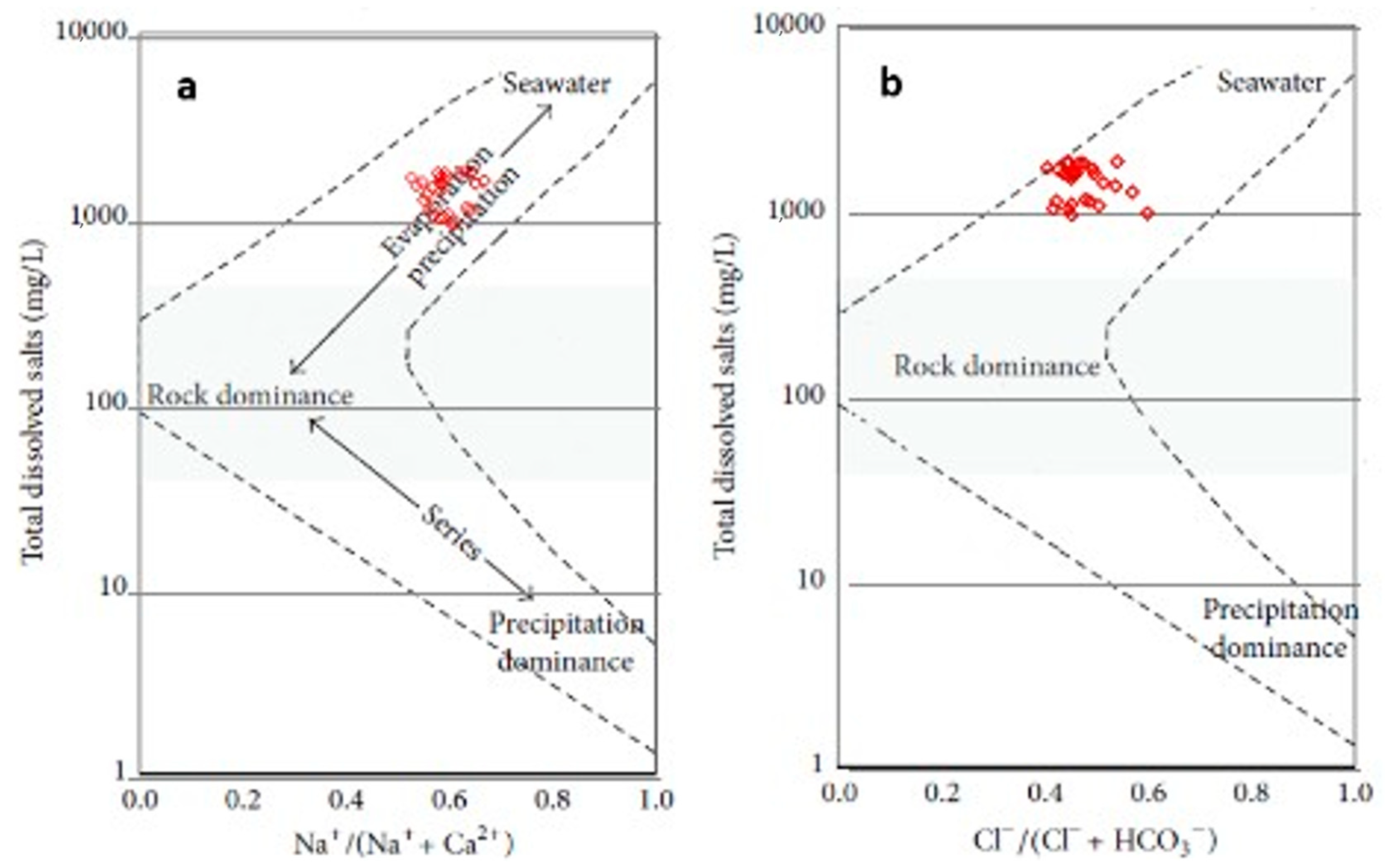 - Climatic and Drainage Influence: The evaporation signature in the upper part of the diagram, combined with the high drainage characteristics of the aquifer, suggests a complex interplay between climatic conditions and hydrogeological factors in determining the final water chemistry.