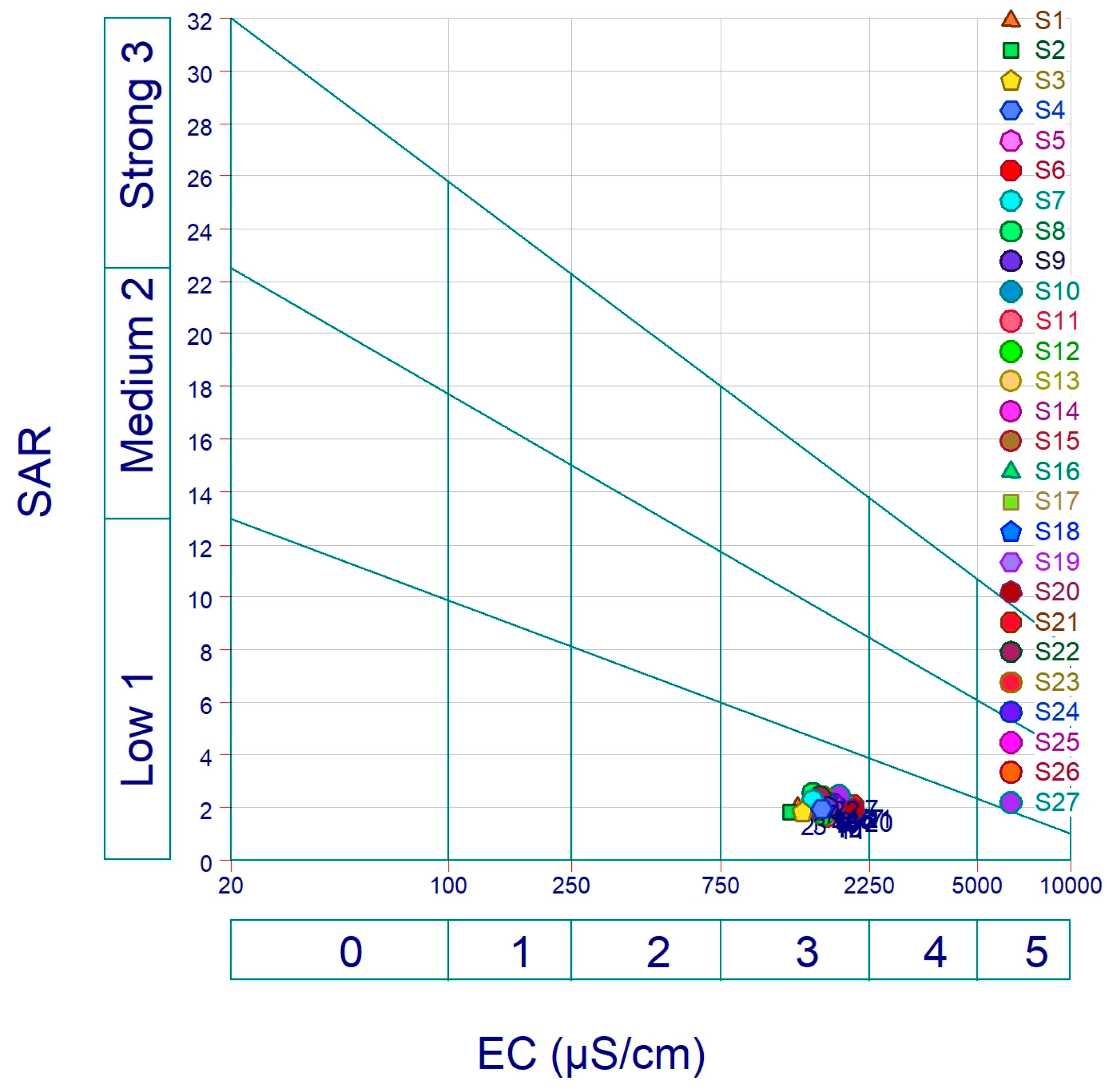 | pH | EC | TDS | HCO3− | Cl | NO3− | SAR | %Na | RSC | KR | PI | MH | |