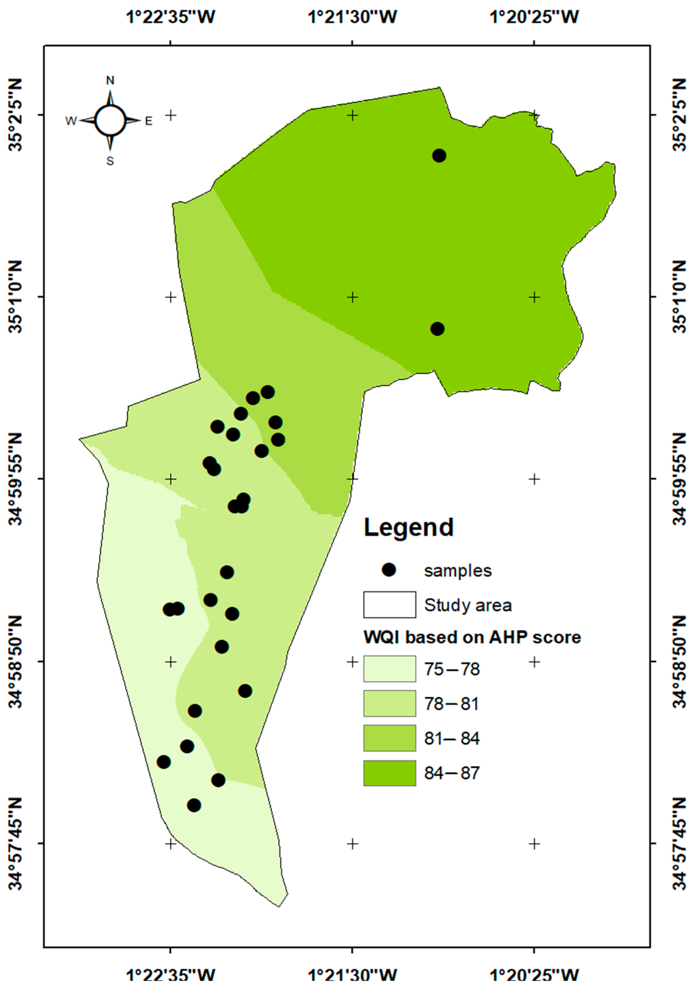 - Sub-index value determination WQI calculation. In this phase, the sub-index values (SIi) for all chemical properties are calculated by multiplying the proportional weight, as given in Equation (11) [72], then summing all the sub-indices from all samples of the study area together to get the final WQI (Equation (4)).