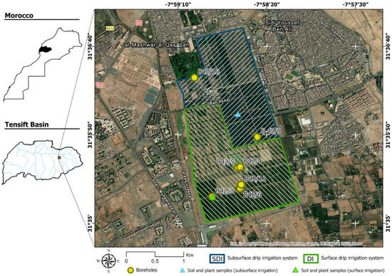 Location of the study area (Royal Domain of Agdal) east of Marrakech (Tensift Basin) highlighting the two experimental fields: surface drip irrigation DI (green hatching) and subsurface-drip irrigation SDI (blue hatching). Wells with groundwater access are shown as yellow circles; soil- and plant-sampling points are marked within each plot.