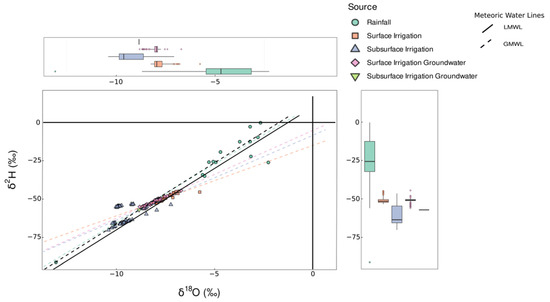 Dual-isotope plot (δ18O vs. δ2H) illustrating the isotopic composition of multiple hydrological compartments (rainfall, groundwater, irrigation water) relative to the global meteoric water line (GMWL) and local meteoric water line (LMWL).