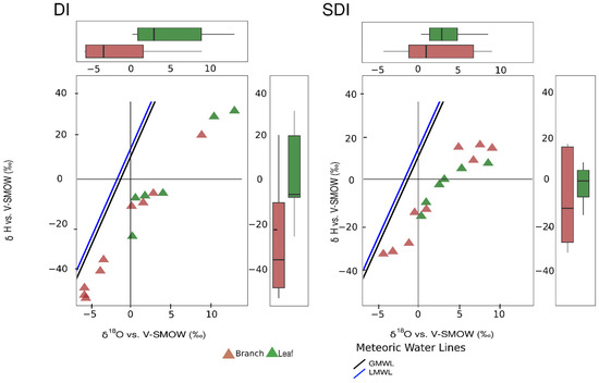 Dual-isotope plot (δ18O vs. δ2H) of branch xylem and leaf water for DI (left) and SDI (right).