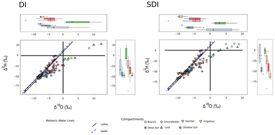 In both treatments, leaf water was on average more enriched in heavy isotopes than branch water, consistent with transpirative enrichment due to kinetic fractionation occurring at the leaf level. This is particularly evident in DI, where the greater isotopic range and higher enrichment suggest stronger evaporative demand and a higher degree of post-uptake fractionation. The evaporation trend of plant water intersects the LMWL both in DI and SDI treatment, but the slope is more acute in SDI, indicating that under subsurface irrigation, plant uptake is dominated by isotopically more stable water likely sourced from deeper, less evaporated zones. This is consistent with findings by Orlowski et al. [37], who reported that irrigation method and water residence time in the soil can significantly influence isotopic source water signatures. In contrast, DI shows greater deviation from the LMWL and a wider spread in both δ18O and δ2H, pointing to greater evaporative enrichment and likely root uptake of near-surface water affected by fractionation. The observed isotopic variability between DI and SDI reflects the physical configuration of the irrigation systems. In SDI, water is delivered at 30 cm, reducing surface exposure and evaporation, thus maintaining lower isotopic values and tighter clustering. In DI, the shallow application of irrigation water increases its exposure to atmospheric demand, enhancing isotopic enrichment before uptake. Similar effects have been documented in controlled experiments by Barbeta et al. [38], who demonstrated that soil surface evaporation can strongly influence the isotopic signature of xylem and leaf water, especially in trees accessing shallow soil water. The isotopic distinction between plant compartments (leaf vs. branch) and irrigation treatments illustrates the integrated effects of plant water uptake strategy, irrigation configuration, and soil evaporation.