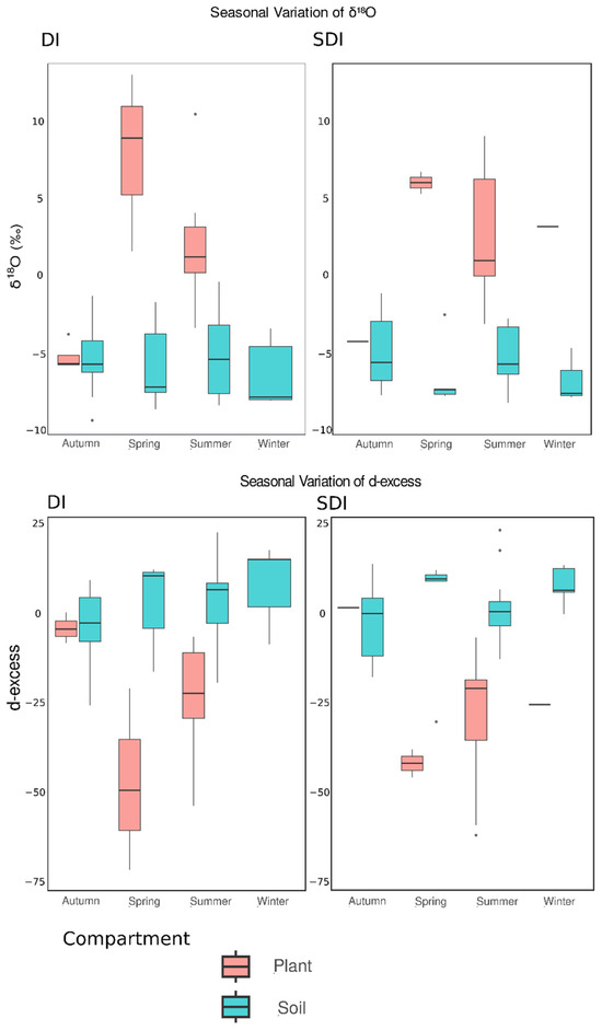 The isotopic composition of branch water reflects the combined influence of source water uptake and post-uptake fractionation processes, though it is not possible to clearly distinguish between xylem and leaf water in the graph. In SDI, plant water d-excess remains relatively stable with a median of roughly −25‰ in summer, with a wide spread down to −60‰. This negative drop of d-excess means that the water has already undergone kinetic evaporation, where 18O is retained preferentially over 2H, either (i) before uptake in near-surface soil that partially dried, or (ii) after uptake through leaf-level fractionation that back-diffuses into the xylem. While in DI, plant water d-excess exhibits clear seasonal variation. During summer, markedly negative d-excess values point to increased reliance on shallow, evaporatively enriched soil water. The high level of enrichment, possibly influenced by leaf water signatures, reflects intensified transpiration under hot, dry conditions. These patterns are consistent with recent studies that report seasonal shifts in plant water isotopic signatures, highlighting the impact of soil enriched water in shaping water uptake and evaporative dynamics [41].