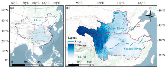 The geographic location and topography of the study area: (a) the location of the Yangtze River Basin and Yellow River Basin within China; (b) the topography of the two basins.