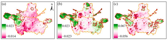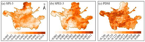 The spatial distribution of drought index trends in the Yangtze River Basin and the Yellow River Basin during 1961–2022: (a) SPI-3; (b) SPEI-3; and (c) PDSI. Trends were estimated using Sen’s slope, and the outlined areas indicate regions with significant trends (p < 0.05) based on the Mann–Kendall test.