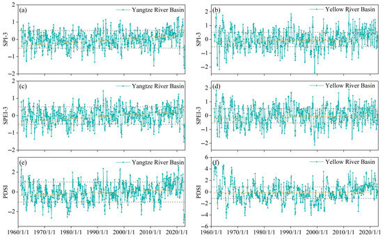 The study further investigated the monthly time series of the three drought indices for the Yangtze and Yellow River Basins from 1961 to 2022 (Figure 3).