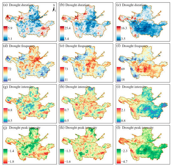 Spatial differentiation of drought characteristics in the Yangtze and Yellow River Basins. Rows represent four different characteristics: (a–c) mean duration (months); (d–f) frequency (events per 62 years); (g–i) mean intensity; and (j–l) mean peak intensity. Columns correspond to the results derived from the three indices: SPI-3 (left), SPEI-3 (middle), and PDSI (right).