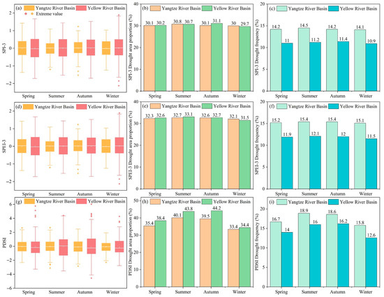 Seasonal comparison of drought characteristics in the Yangtze River Basin and the Yellow River Basin. Panels (a,d,g) show the boxplots of SPI-3, SPEI-3, and PDSI, respectively. Panels (b,e,h) represent the seasonal drought area proportion for each index. Panels (c,f,i) illustrate the seasonal drought frequency for each index.