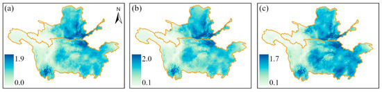 The long-term mean spatial distributions of SPI-3 and SPEI-3 (Figure 2a,b) exhibit a high degree of consistency. Across the vast majority of both basins, their values hover close to zero, which is consistent with the theoretical expectation that the long-term mean of standardized indices should approach zero. However, subtle regional nuances emerge upon closer inspection. The northern part of the Yellow River Basin displays faintly positive values, indicating a marginally wetter climatology. In contrast, the Yangtze River Basin exhibits greater homogeneity, with most of its area residing in a state of strict climatological normality. In stark contrast, the long-term mean PDSI (Figure 2c) reveals significant and geographically distinct drought patterns, with pronounced inter-basin disparities. Within the Yangtze River Basin, a persistent climatological drought is highly concentrated in the upstream headwaters, indicating that this region experiences chronic moisture deficit stress. Conversely, the middle and lower Yangtze plains are generally near normal or slightly wet. In the Yellow River Basin, the climatologically drought-prone areas are predominantly located in the Loess Plateau of the middle reaches and the southern parts of the basin. While the drought intensity here is less severe than in the upper Yangtze, its spatial extent is considerably broader. Notably, the headwater region of the Yellow River does not exhibit a comparable drought state to that of the Yangtze source region under PDSI; instead, it remains close to climatologically normal conditions.