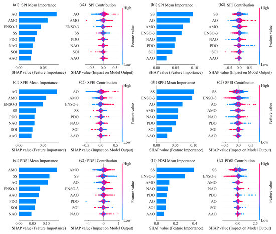 The relative importance and contribution of large-scale climate factors to drought, as revealed by the SHAP model. The left column (a,c,e) displays results for the Yangtze River Basin, and the right column (b,d,f) displays results for the Yellow River Basin. The rows represent different drought indices: (a,b) for SPI-3, (c,d) for SPEI-3, and (e,f) for PDSI. For each panel, (a1,b1,c1,d1,e1,f1) show the SHAP mean importance, and (a2,b2,c2,d2,e2,f2) show the SHAP summary contribution.