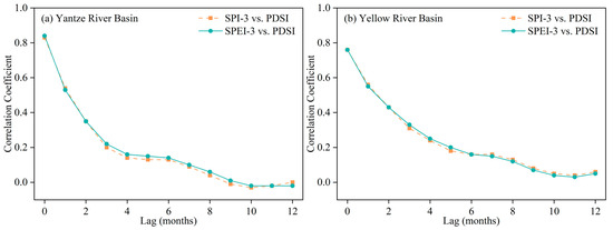 Lagged response of drought propagation in (a) the Yangtze River Basin and (b) the Yellow River Basin. Approximately 83% of the lagged correlations are statistically significant (p < 0.05).