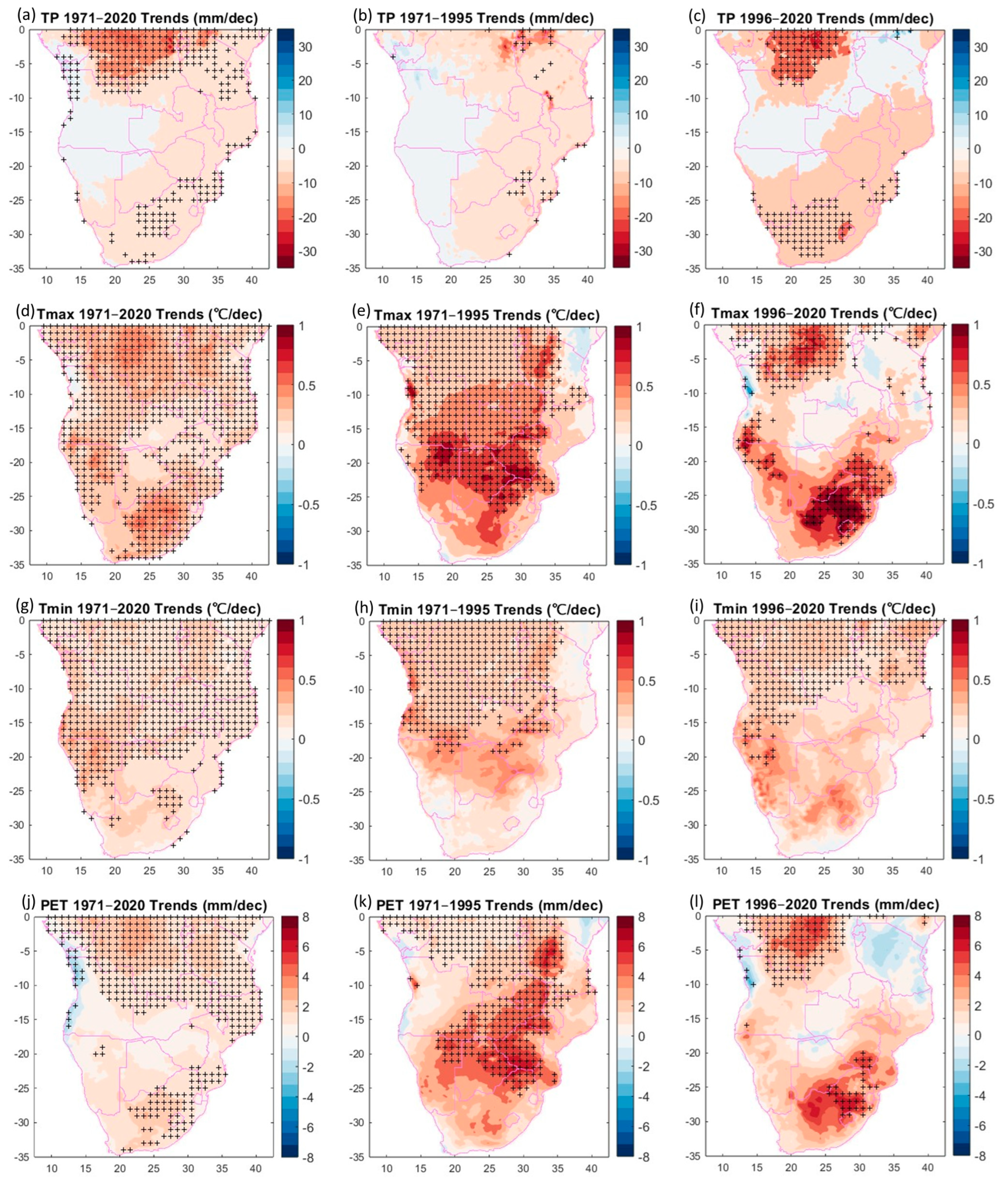 Figure 2h,i) also show increasing Tmin, with spatial patterns very similar to those for the entire period. Additionally, the area of statistically significant increasing trends decreases when the analysis evolves from the 50-year (1971–2020) to each subperiod (1971–1995 and 1996–2020). In the first subperiod, the region of statistically significant trends is roughly defined between 0° and 18° S and between the west coast and 35° E (