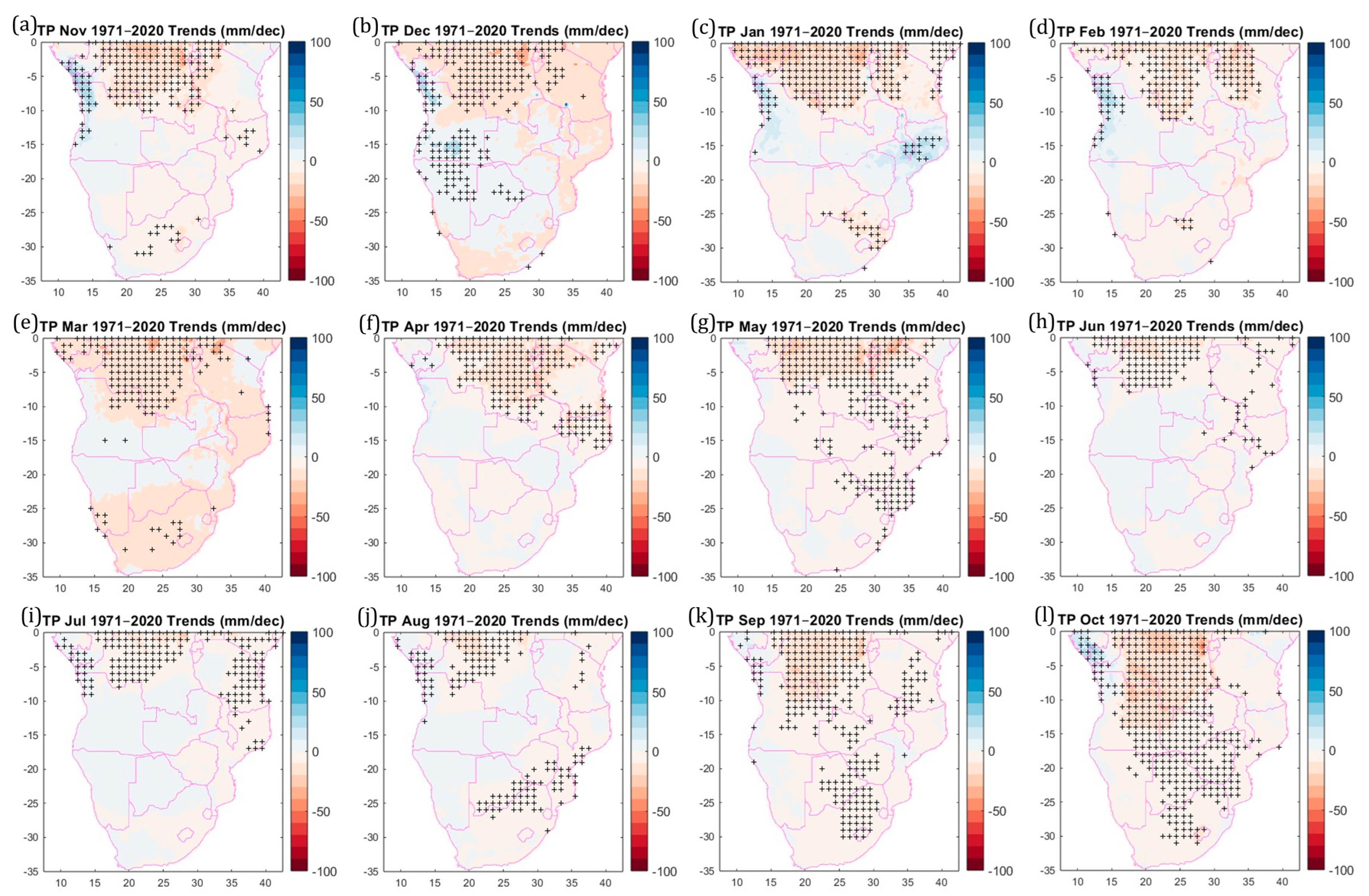 Figure 2a) and disclose a seasonal variability in the sign, value and area with statistically significant decreasing and increasing trends. Trends’ spatial patterns for all and each month are relatively similar, especially during the core rainy season (from November to April). Min and P10 values of the decreasing trends are smaller this season. Decreasing trends in the dry season are much higher, except in October, when the TP trend Min and P10 are similar to the rainy season. The lowest trends are observed in the DRC, northern Angola, Mozambique and relatively small/localised areas of southern South Africa. Total area with statistically significant trends is approximately constant during the rainy season, but is smaller from June to August and higher in September and November.