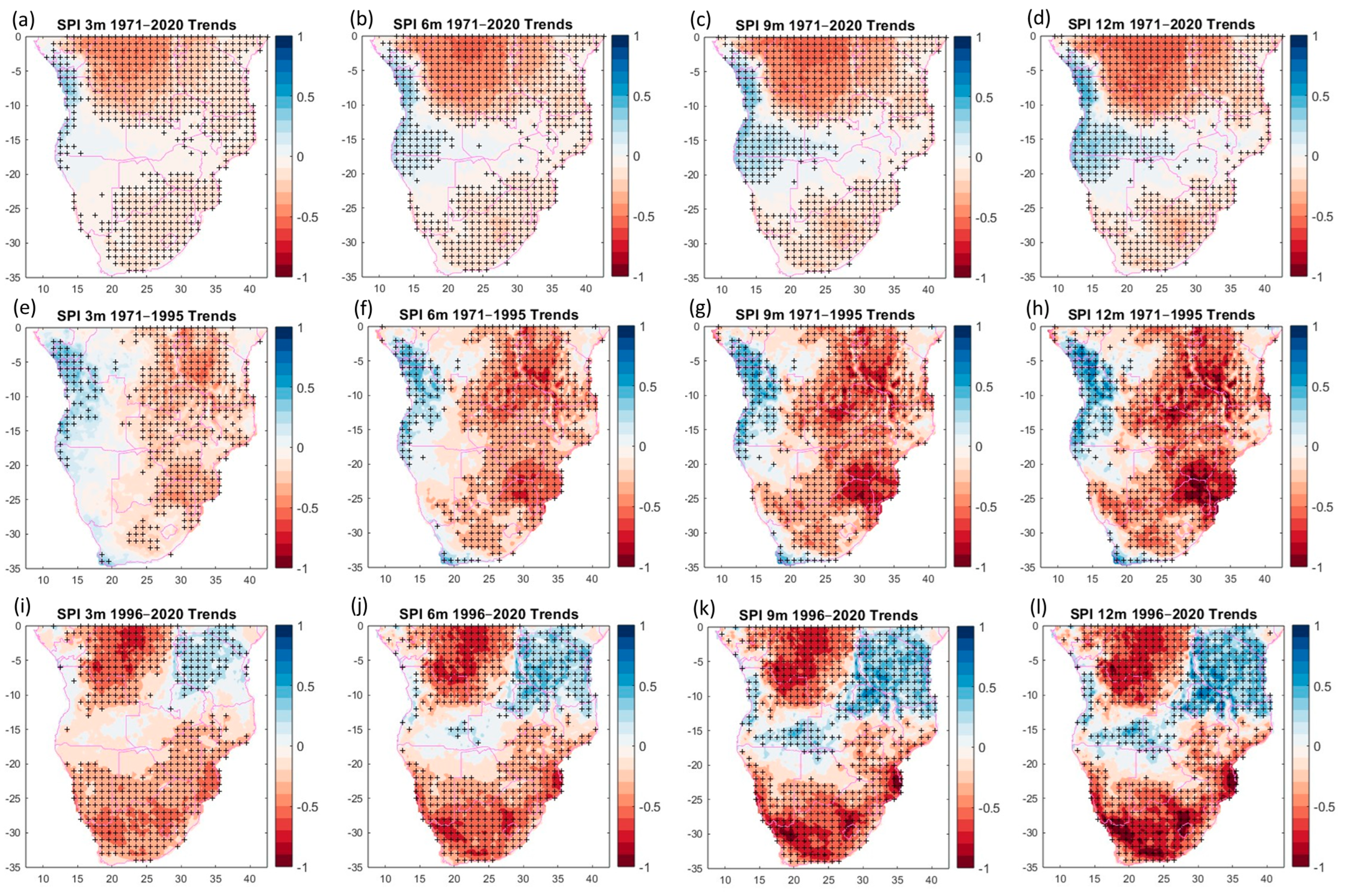 Figure 7i–l), statistically significant negative trends are observed in the tropical forest region, NE of Angola, DRC, Gabon and in southern SA (20 to 35° S), while increasing trends are evident in the NE of SA at the 3-month timescale but expands to the central and west coast as the timescale increases.