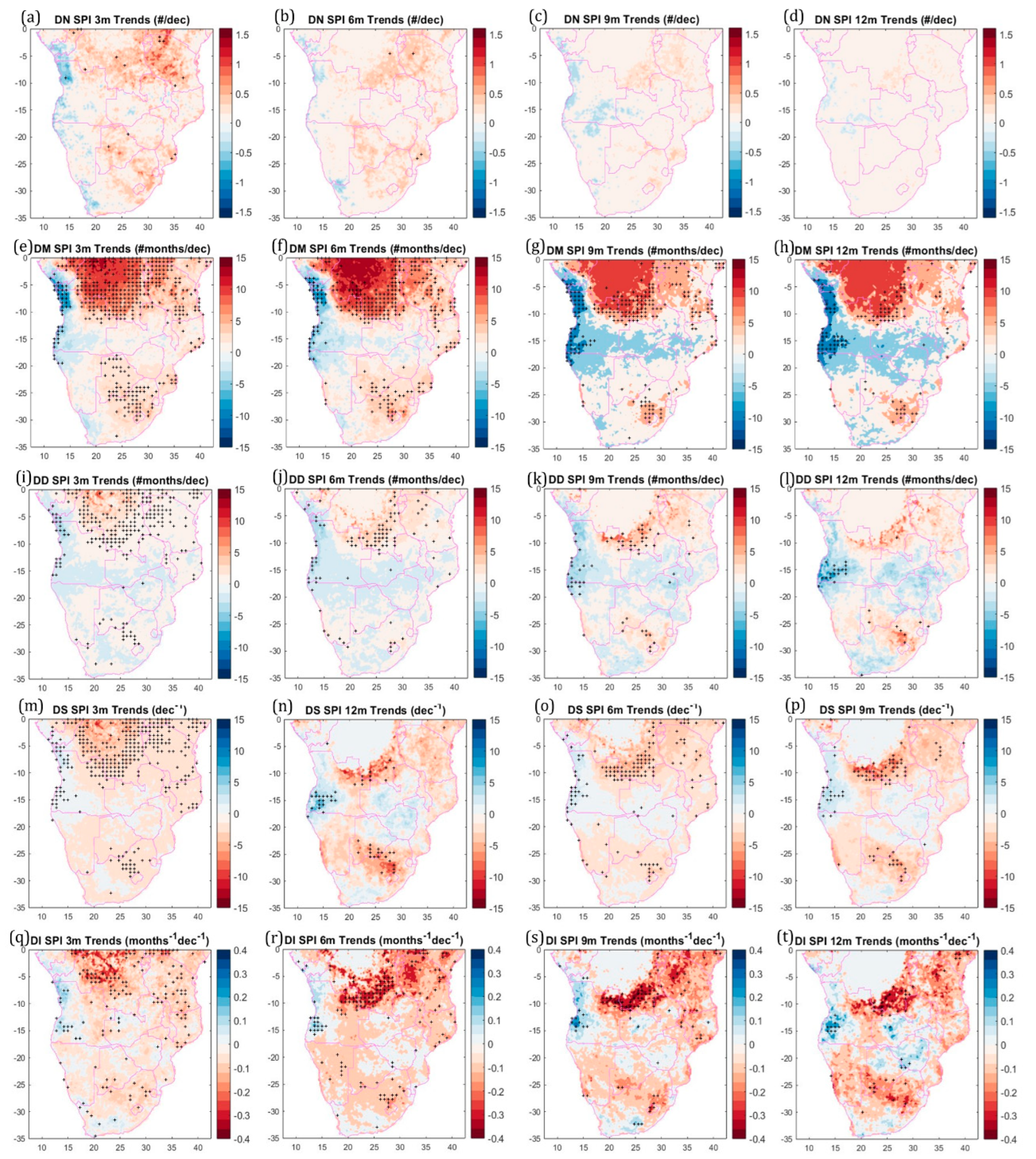 Table 3). Four significant results are observed in general. First, the trend pattern for all drought descriptors is very similar, in the sense that it is characterised by increasing trends across almost the entire SA territory except for a narrow region of the Angolan coast, which, in some cases (DM, DD and, to a lesser extent, DS and DI), extends inland, in a latitudinal band around 15° S, almost to the eastern (at the 6-, 9- and 12-month timescales). Second, the trend values may vary, but the trend patterns for each descriptor do not change significantly as the timescale increases. One of the exceptions is the DM, for which an increase in the area of decreasing trend and a decrease in the area of statistically significant trend are observed, in the same latitudinal band around 15° S. The other is observed in the central region of SA for DD, DS and DI. While for the 3-month timescale, the pattern is relatively smooth in the central and south SA (at south of 10° S), two regions of positive (south of Angola/Angola Coast and Zimbabwe/north Limpopo and south Zambezi) and negative (Orange and southern Congo/northern Zambezi basins) statistically significant trends become evident, as the timescale increases. Third, the area with statistically significant trends decreases as the timescale increases. Fourth, the trend maximum absolute value for DM, DS and DI calculated with the SPEI on all time scales is higher than that calculated with the SPI. The opposite is true for DN at the 3-month scale and DD at the 9- and 12-month scales.