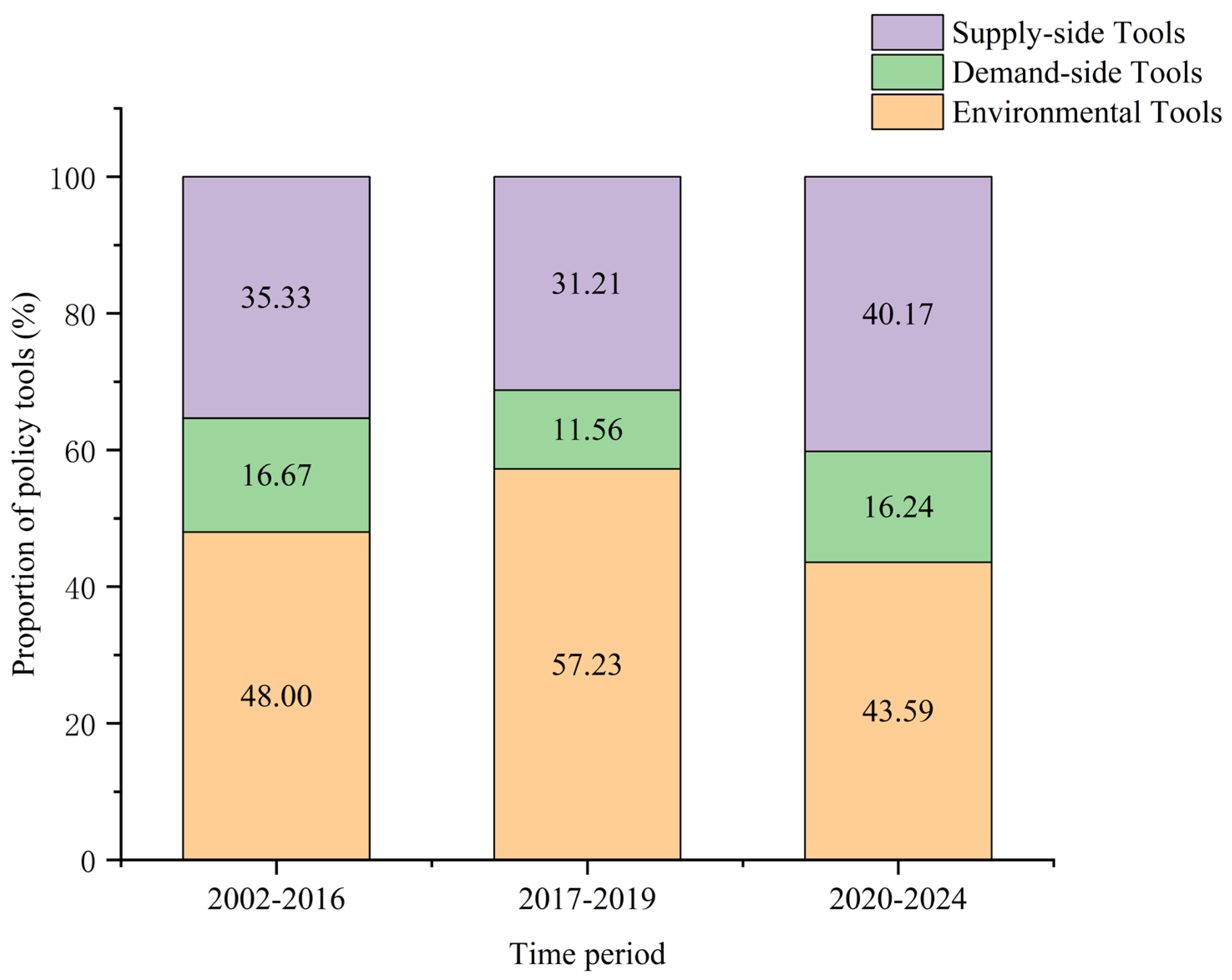 - Policy Tool Structure Imbalance and Phased Adjustments: Policy tools remained imbalanced over time, marked by resource-heavy but capacity-weak features, rigid designs with limited flexibility, and strong reliance on publicity while lacking market-based mechanisms. Environmental tools consistently dominated, rising initially before declining, and shifting from rigid enforcement standards to broader institutional frameworks, though regional adaptability remained limited. Supply-side tools declined initially but rose later, transitioning from fiscal subsidies to cross-regional platform construction and employment assistance, yet fiscal dependence persisted and training programs accounted for less than 10%. Demand-side tools remained weak, relying primarily on publicity, with insufficient market incentives and social supervision.