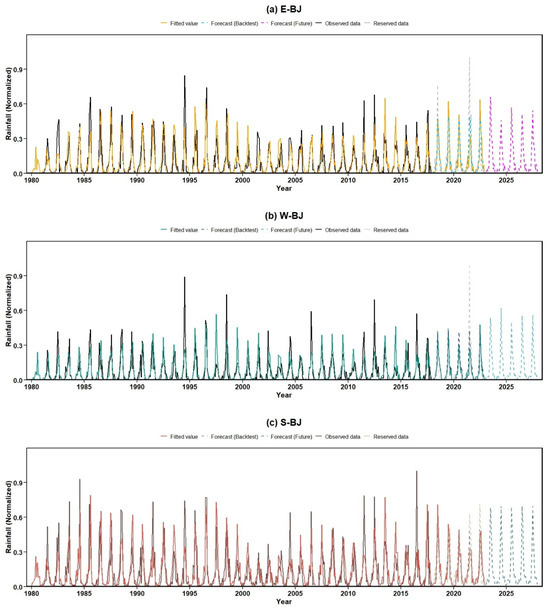 Projections were based on the historical annual precipitation (1980–2022) from the Chinese Meteorological Administration, which shows notable interannual variability. Figure 3 illustrates monthly rainfall patterns across five Beijing regions (E-BJ, W-BJ, S-BJ, N-BJ, M-BJ), with the west recording the maximum monthly rainfall (616.9 mm). Ensuring reliable time series modeling requires stationarity, assessed here using the Augmented Dickey–Fuller test. Results (p < 0.05) confirm the series is stationary, supporting its suitability for forecasting.