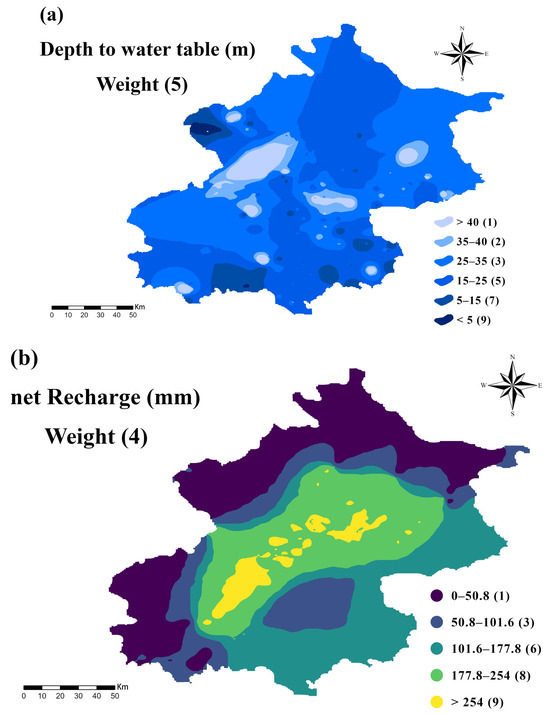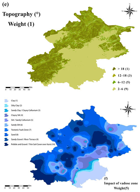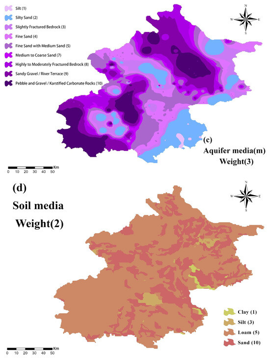 Groundwater vulnerability in Beijing was initially assessed using the classic DRASTIC model framework [24]. which quantifies vulnerability by exponentially weighting seven key hydrogeological parameters: groundwater depth (D), net recharge (R), aquifer media (A), soil media (S), topography (T), impact of the unsaturated zone (I), and aquifer hydraulic conductivity (C). Each parameter is assigned a rating (1–10) and a fixed weight (1–5) to reflect its relative influence on pollution potential (see Table S1 in the Supplementary Material) [25]. The comprehensive DRASTIC index is calculated as: