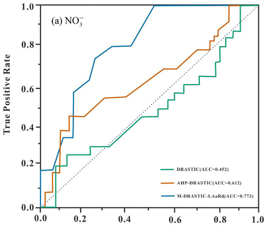The credibility of groundwater vulnerability models, such as DRASTIC, relies on validation against empirical hydrochemical data [35,36]. Since aquifer contamination is typically multi-factorial, single-parameter validation is often insufficient [37]; thus, a multi-parameter approach offers a more robust assessment [38]. In this study, Magnesium (Mg2+), Nitrate (NO3−), and Chloride (Cl−) were used to quantitatively validate the model [39,40,41]. While Mg2+ is a natural groundwater constituent, its concentration in the study area is significantly influenced by human activities, including industry and agriculture, making it a sensitive tracer of groundwater perturbation. Mg2+ complements conventional indicators by reflecting both natural and anthropogenic impacts. Model validation employed Receiver Operating Characteristic (ROC) curve analysis [42,43], with the Area Under the Curve (AUC) quantifying predictive accuracy. An AUC near 1.0 indicates strong agreement between predicted vulnerability and observed contamination [44,45,46,47,48]
