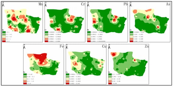 2. Uneven spatial distribution, Mn, Fe, and As pollution are mainly concentrated in the north, related to geological structure, groundwater redox environment, and industrial activities. Pb, Cu, and Zn are mainly distributed in densely populated industrial areas and transportation hubs.