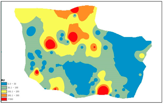 The Water Quality Index (WQI) is a comprehensive evaluation method that quantifies the overall quality of groundwater by integrating the measured concentrations of multiple contaminants in groundwater into a single value [27]. In this paper, eight heavy metal elements in the groundwater of the South Dongting Lake Basin are targeted to evaluate the water quality index (WQI), and the obtained WQI values are interpolated and analyzed by using the inverse distance weighting (IDW) method, to clarify the risk areas of high pollution and to draw a map of water quality risk areas. When calculating the WQI, different weights are assigned to the parameters according to their importance to human health or ecological hazards [28]. Heavy metals such as As and Cd were assigned the highest weight (5.0) due to high toxicity, followed by Fe, Mn, Cu, Zn, Pb (2.0–4.0). The formula was calculated as follows [29,30]:
