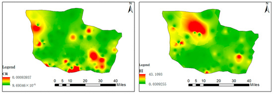 Spatial distribution of CR and HQ in the study area.