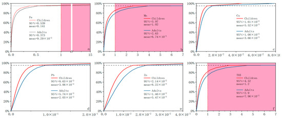 Cumulative probability of predicted non-carcinogenic risk (a) Fe; (b) Mn; (c) Cu; (d) Pb; (e) Zn; (f) THI.