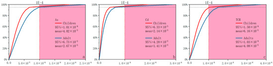 Cumulative probability of predicted cancer risk (a) As; (b) Cd; (c) TCR.