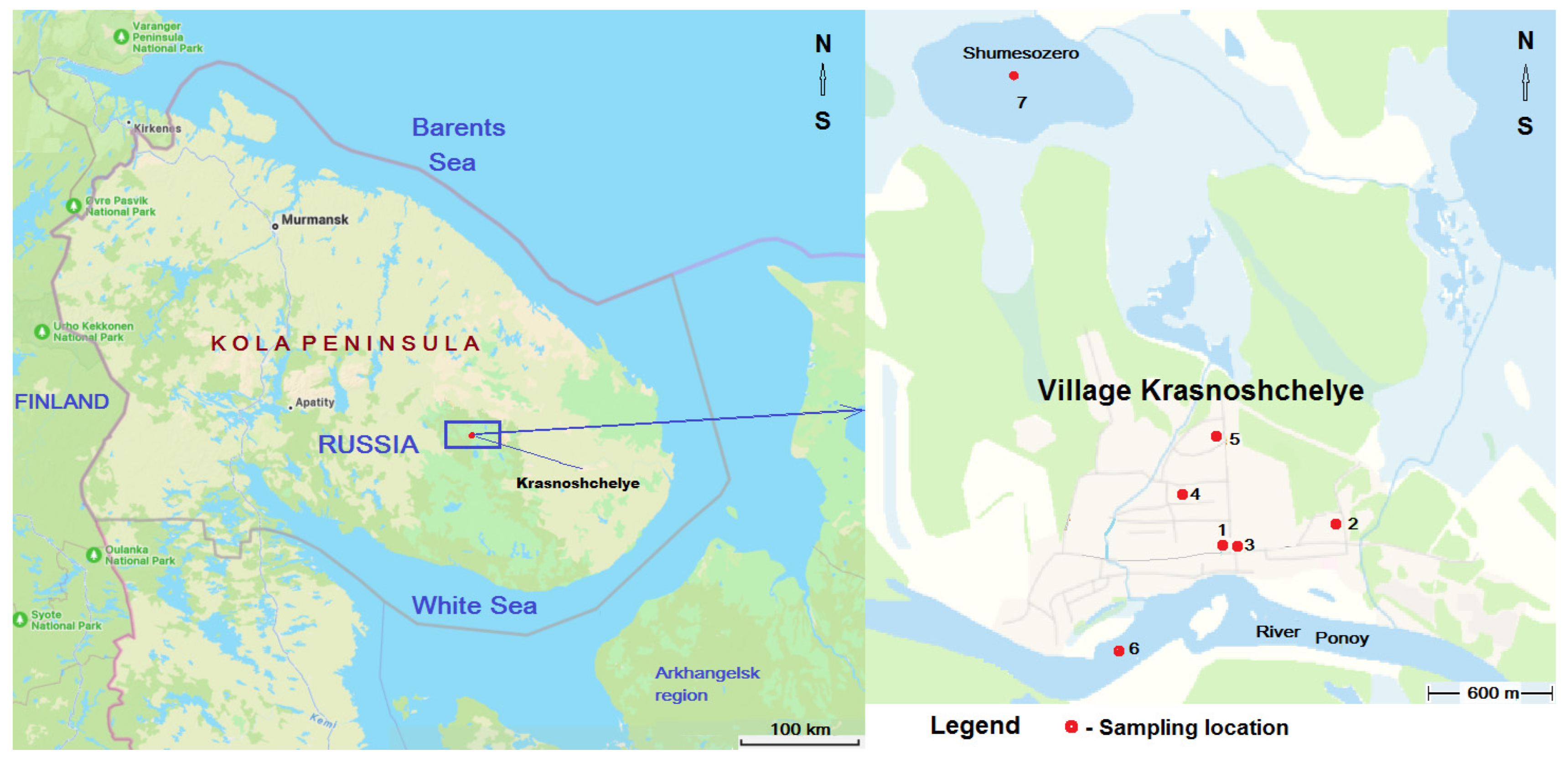 - Sandimirov, S.S.; Pozhilenko, V.I.; Mazukhina, S.I.; Drogobuzhskaya, S.V.; Shirokaya, A.A.; Tereshchenko, P.S. Chemical Composition of Natural Waters of the Lovozero Massif, Russia. Model. Earth Syst. Environ. 2022, 8, 4307–4315. [Google Scholar] [CrossRef]