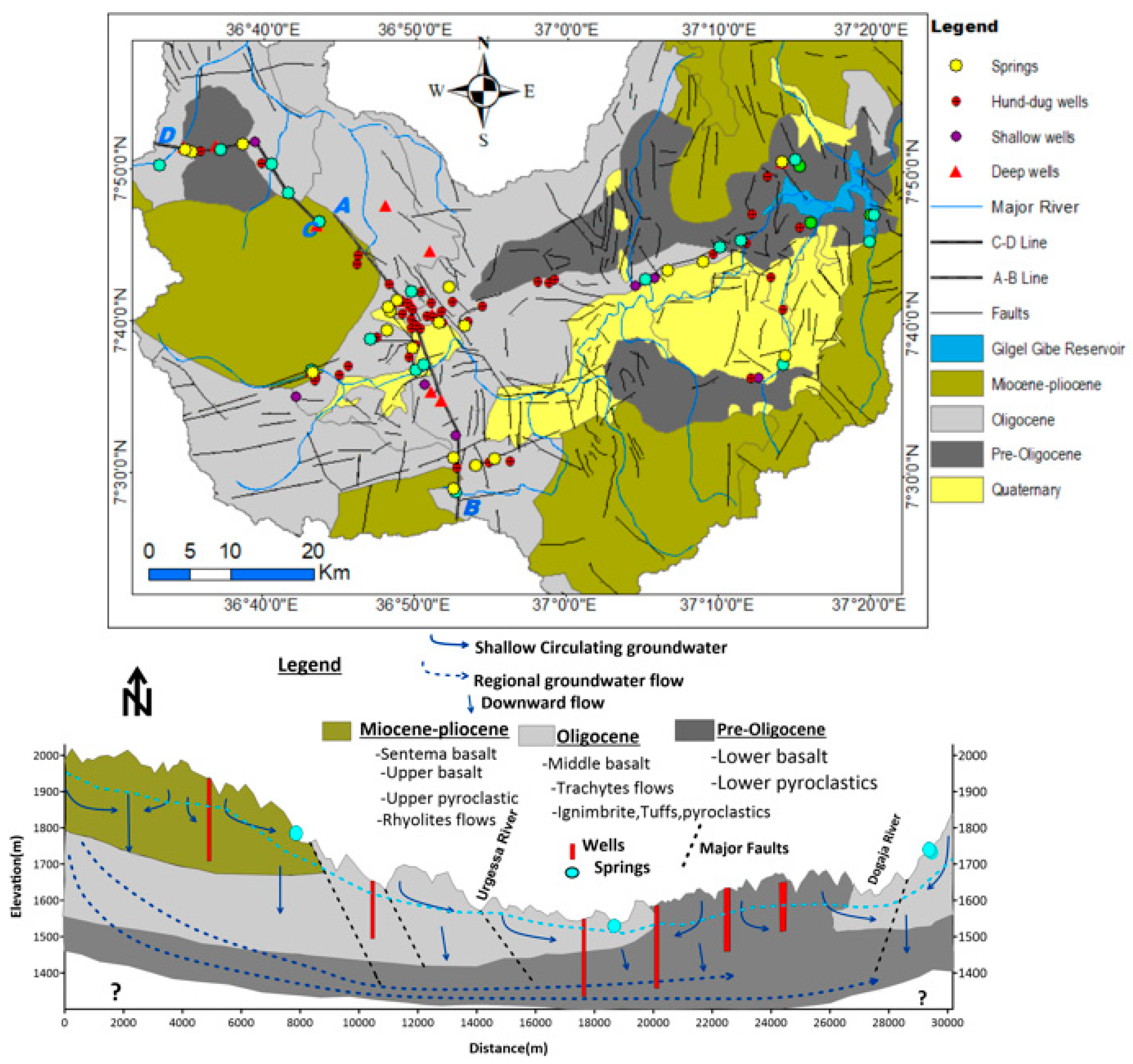 Figure 14). The cross section started from Sentema highland which acts as a surface water divide for both Gilgel Gibe and Dhidhessa catchments and comprises upper Tertiary volcanic rock. This cross-section illustrates potential groundwater flow lines (