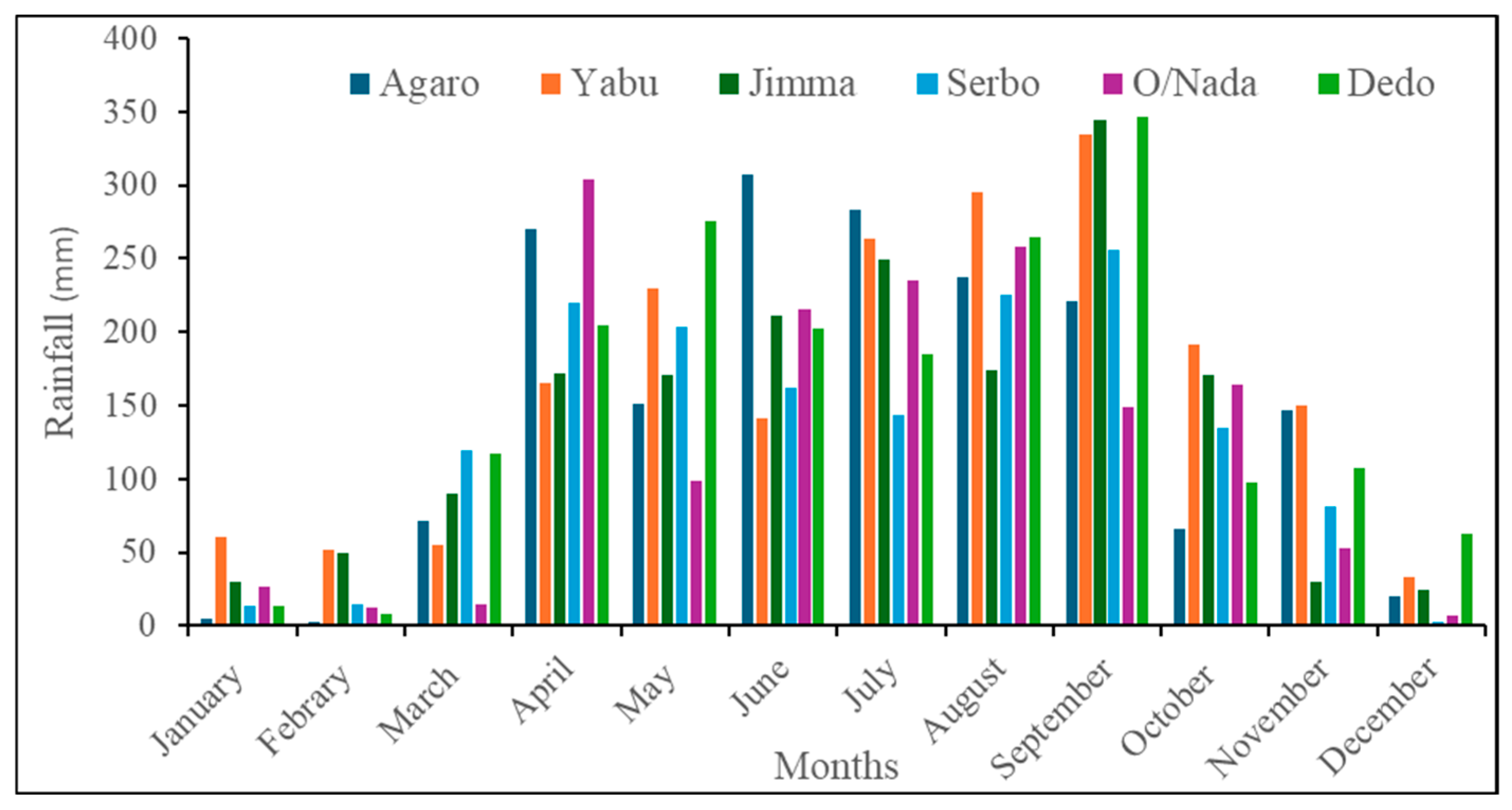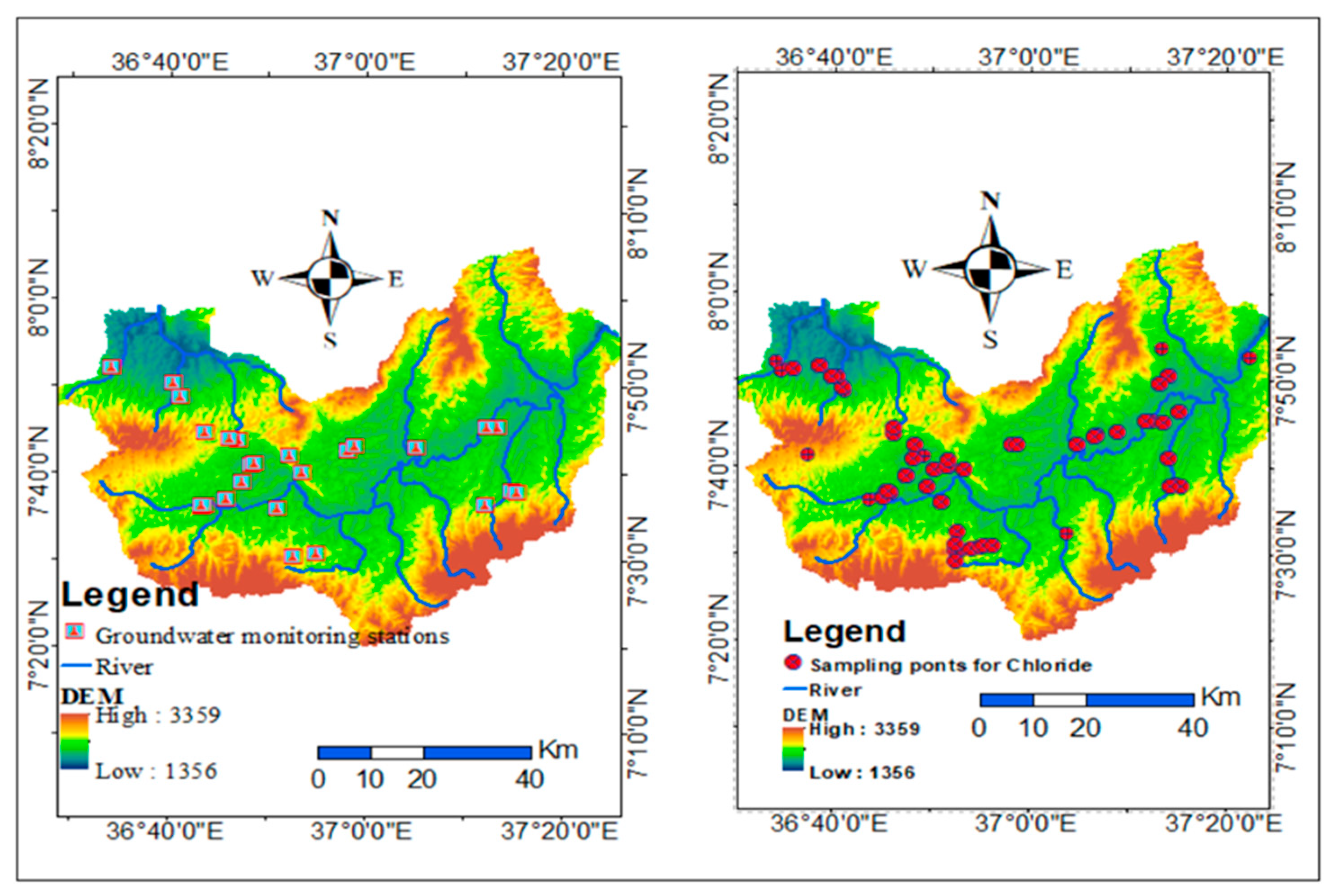 26], the CMB method, is suitable for humid climates, which align with the characteristics of the Gilgel Gibe and Upper Dhidhessa catchments. The advantages of CMB approach are its simplicity and cost-effectiveness, as it requires only data on annual precipitation and its chloride concentration, along with the chloride concentration of groundwater within the aquifer of interest. Chloride serves as a natural tracer; it reflects the cumulative effects of recharge over extended periods rather than short-term fluctuations [